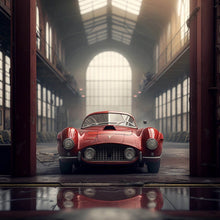 - Motivname: Klassischer roter Sportwagen in industrieller Halle