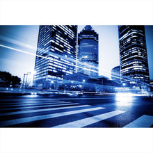 Das Bild zeigt eine lebhafte städtische Szene, die bei Nacht aufgenommen wurde. Im Vordergrund sieht man eine breite Straße mit einem Zebrastreifen, der sich quer über die Fahrbahn zieht. Auf der Straße sind die Lichter vorbeifahrender Fahrzeuge als lange, leuchtende Streifen eingefangen, was den Eindruck von Geschwindigkeit und Bewegung vermittelt. Diese Lichtspuren verleihen dem Bild eine dynamische und energiegeladene Atmosphäre. Hinter der Straße ragen beeindruckende Hochhäuser in den Nachthimmel. Die Fassaden der Gebäude sind größtenteils aus Glas, wodurch das Licht von innen nach außen strahlt und die moderne Architektur betont wird. Die Gebäude sind hell erleuchtet, und die vielen Fenster reflektieren das Licht, was der Skyline einen glitzernden Effekt verleiht. Die überwiegende Farbgebung des Bildes ist in Blautönen gehalten, was eine kühle und futuristische Stimmung erzeugt. Diese Farbpalette verstärkt die urbane und moderne Anmutung der Szene. Der Himmel und die beleuchteten Wolkenkratzer verschmelzen fast miteinander, wodurch die Stadtlandschaft sowohl majestätisch als auch einladend wirkt. Insgesamt vermittelt das Bild das Gefühl einer pulsierenden Metropole, die niemals schläft. Es fängt die Essenz des modernen städtischen Lebens ein, mit all seiner Hektik, seinem Glanz und seiner ständigen Bewegung.