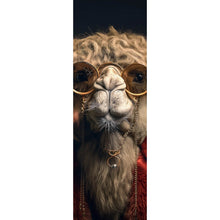 • Lade das Bild in den Galerie-Viewer, Aluminiumbild Stylisches Kamel mit Brille und rotem Mantel Panorama Hoch
