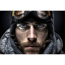 • Lade das Bild in den Galerie-Viewer, Leinwandbild Abenteuerlicher Mann mit eisblauen Augen im Schnee Querformat