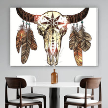 Auf der Suche nach einem ausgefallenen Wandbild als Leinwandbild? Das Motiv Büffelschädel mit Federn im Querformat gefällt dir und du hast nach Wandbildern mit den Wörtern Schädel, Büffel, Federn, Totem, Indianer, Kunst, Amerika und Boho gesucht? Dann ist dieses Leinwandbild in den Farben Braun und Weiß genau das richtige Wandbild und Dekorelement für dich! Setze ein Highlight an deiner Wand! Das Leinwandbild Büffelschädel mit Federn ist in 5 verschiedenen Größen verfügbar, von klein und dezent bis hin zum XXL Leinwandbild.