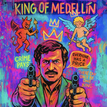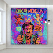 Dieses eindrucksvolle Pop-Art-Wandbild zeigt eine ikonische Figur, die mit entschlossenem Gesichtsausdruck in die Mitte des Bildes gerückt ist. Die Person hält zwei Pistolen und hat eine markante Mimik, die Entschlossenheit und Macht ausstrahlt. Umgeben ist die Figur von leuchtenden Neonfarben, die das Bild lebendig und dynamisch wirken lassen. Oben prangt der Schriftzug "King of Medellín", der auf die berüchtigte Vergangenheit der Stadt und die damit verbundene Person hinweist. Links neben der Figur steht ein roter Teufel mit einem Dreizack und der Aufschrift "Crime Pays", während auf der rechten Seite ein Engel mit blauen Flügeln zu sehen ist, der ein Schild mit der Aufschrift "Art is not a crime" hält. Diese Figuren symbolisieren den inneren Konflikt zwischen Gut und Böse. Weiterhin finden sich Sprechblasen mit Texten wie "Everyone has a price" und "There can only be one king", die die Themen Macht und Korruption ansprechen. Unten steht der Slogan "Plata o Plomo", was übersetzt "Silber oder Blei" bedeutet, ein Ausdruck, der auf das berüchtigte Drogenkartell des Medellín-Königs hinweist. Die leuchtenden Farben Blau, Pink und Gelb verleihen dem Bild eine intensive, fast hypnotische Wirkung und unterstreichen die dramatische und provokante Botschaft des Kunstwerks.