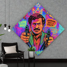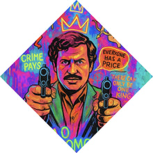 Dieses eindrucksvolle Pop-Art-Wandbild zeigt eine ikonische Figur, die mit entschlossenem Gesichtsausdruck in die Mitte des Bildes gerückt ist. Die Person hält zwei Pistolen und hat eine markante Mimik, die Entschlossenheit und Macht ausstrahlt. Umgeben ist die Figur von leuchtenden Neonfarben, die das Bild lebendig und dynamisch wirken lassen. Oben prangt der Schriftzug "King of Medellín", der auf die berüchtigte Vergangenheit der Stadt und die damit verbundene Person hinweist. Links neben der Figur steht ein roter Teufel mit einem Dreizack und der Aufschrift "Crime Pays", während auf der rechten Seite ein Engel mit blauen Flügeln zu sehen ist, der ein Schild mit der Aufschrift "Art is not a crime" hält. Diese Figuren symbolisieren den inneren Konflikt zwischen Gut und Böse. Weiterhin finden sich Sprechblasen mit Texten wie "Everyone has a price" und "There can only be one king", die die Themen Macht und Korruption ansprechen. Unten steht der Slogan "Plata o Plomo", was übersetzt "Silber oder Blei" bedeutet, ein Ausdruck, der auf das berüchtigte Drogenkartell des Medellín-Königs hinweist. Die leuchtenden Farben Blau, Pink und Gelb verleihen dem Bild eine intensive, fast hypnotische Wirkung und unterstreichen die dramatische und provokante Botschaft des Kunstwerks.