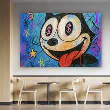 Das Bild zeigt eine fröhliche Cartoon-Katze mit großen, ausdrucksstarken Augen, in denen rosa Dollarzeichen zu sehen sind. Die Katze hat ein breites Lächeln und eine herausgestreckte Zunge, was dem Bild einen humorvollen und verspielten Charakter verleiht. Der Hintergrund ist in kräftigen Blautönen gehalten, die durch gelbe und pinke Akzente ergänzt werden. Über den gesamten Hintergrund sind Graffiti-Elemente verteilt, darunter verschiedene Sterne, Dollar- und Yen-Zeichen sowie bunte Kritzeleien. Am oberen Rand und am unteren Rand des Bildes sind asiatische Schriftzeichen zu sehen, die dem Bild eine zusätzliche kulturelle Dimension verleihen. Die Kombination aus Pop-Art-Elementen und Street-Art-Stil verleiht dem Bild einen modernen und dynamischen Look. Die lebendigen Farben und das verspielte Design ziehen den Betrachter in ihren Bann und vermitteln ein Gefühl von Kreativität und Optimismus.