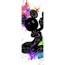 Das Bild zeigt eine schwarze Silhouette, die stilistisch an eine bekannte Maus-Figur erinnert, aber mit einem rebellischen Twist. Die Silhouette ist mit verschiedenen Graffiti-Schriftzügen und Symbolen bedeckt, darunter Wörter wie "LOVE", "HATE", und andere Ausdrücke, die eine gewisse Provokation und Anti-Haltung suggerieren. Diese Schriftzüge sind in Weiß auf dem schwarzen Umriss der Figur geschrieben und verleihen dem Bild eine moderne, urbane Atmosphäre. Im Hintergrund der Figur sind lebendige Farbspritzer in Pink, Blau und Grün zu sehen, die dem Bild einen kraftvollen und dynamischen Effekt verleihen. Diese bunten Spritzer kontrastieren scharf mit der schwarzen Silhouette und schaffen einen auffälligen visuellen Effekt. Die Farbexplosion scheint von der Figur auszugehen, was den Ausdruck von Kreativität und künstlerischer Freiheit verstärkt. Die Kombination aus der bekannten Silhouette, den rebellischen Schriftzügen und den leuchtenden Farben verleiht dem Bild eine starke popkulturelle Ästhetik. Es spricht Themen wie Individualität, Rebellion und künstlerischen Ausdruck an und könnte in einem urbanen oder modernen Kunstkontext platziert sein. Die Farbpalette und das Design machen es zu einem auffälligen Kunstwerk, das sowohl ansprechend als auch provokativ ist.