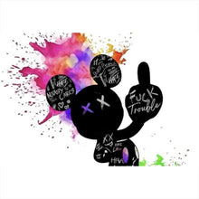 Das Bild zeigt eine schwarze Silhouette, die stilistisch an eine bekannte Maus-Figur erinnert, aber mit einem rebellischen Twist. Die Silhouette ist mit verschiedenen Graffiti-Schriftzügen und Symbolen bedeckt, darunter Wörter wie "LOVE", "HATE", und andere Ausdrücke, die eine gewisse Provokation und Anti-Haltung suggerieren. Diese Schriftzüge sind in Weiß auf dem schwarzen Umriss der Figur geschrieben und verleihen dem Bild eine moderne, urbane Atmosphäre. Im Hintergrund der Figur sind lebendige Farbspritzer in Pink, Blau und Grün zu sehen, die dem Bild einen kraftvollen und dynamischen Effekt verleihen. Diese bunten Spritzer kontrastieren scharf mit der schwarzen Silhouette und schaffen einen auffälligen visuellen Effekt. Die Farbexplosion scheint von der Figur auszugehen, was den Ausdruck von Kreativität und künstlerischer Freiheit verstärkt. Die Kombination aus der bekannten Silhouette, den rebellischen Schriftzügen und den leuchtenden Farben verleiht dem Bild eine starke popkulturelle Ästhetik. Es spricht Themen wie Individualität, Rebellion und künstlerischen Ausdruck an und könnte in einem urbanen oder modernen Kunstkontext platziert sein. Die Farbpalette und das Design machen es zu einem auffälligen Kunstwerk, das sowohl ansprechend als auch provokativ ist.