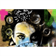 Auf dem Bild ist eine künstlerische Darstellung einer Frau zu sehen, die eine Tasse vor ihrem Gesicht hält. Die Komposition ist stark von leuchtenden Farben geprägt, die in einer Mischung aus Blau, Grün, Pink und Gelb erscheinen. Der Hintergrund ist dunkel gehalten, was die lebhaften Farben noch stärker betont. Die Frau blickt mit intensiven Augen direkt den Betrachter an. Ihre Frisur ist mit lockigen Elementen gestaltet, die ebenfalls künstlerisch akzentuiert sind. Oberhalb der Frau sind künstlerische Schriftzüge und Symbole zu erkennen, die dem Bild eine zusätzliche Ebene von Kreativität verleihen. Die Tasse ist mit einem floralen Muster verziert, das sich harmonisch in das Gesamtbild einfügt. Verschiedene Texturen und Pinselstriche schaffen eine dynamische und vielschichtige Oberfläche. Diese Collage aus Farben, Formen und Linien vermittelt einen modernen, pop-art-ähnlichen Stil, der sowohl Ausdruck als auch Emotion einfangen soll. Die Gesamtkomposition wirkt lebendig und inspiriert, ideal für Kunstliebhaber, die nach visuellem Ausdruck und Tiefe suchen.