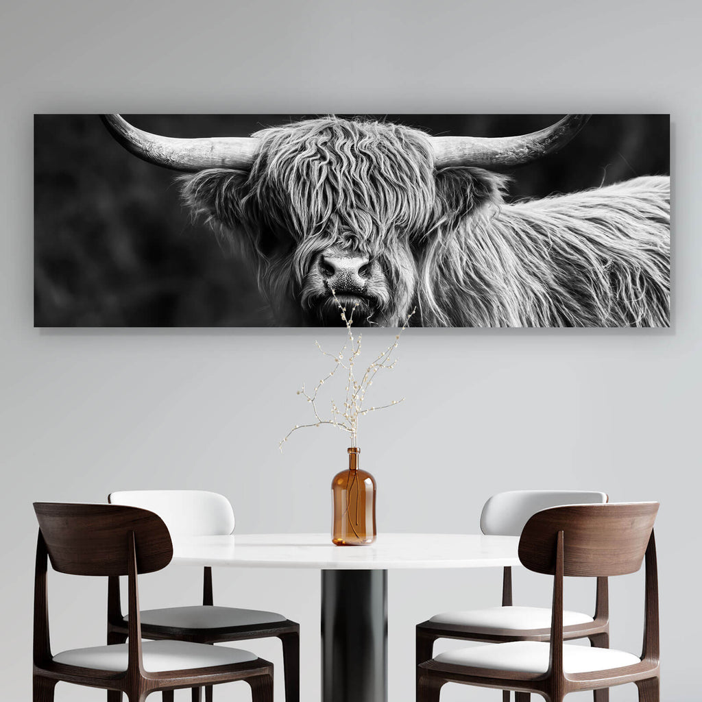 Auf der Suche nach einem ausgefallenen Wandbild als Leinwandbild? Das Motiv Highland Rind Schwarz-Weiß im Panorama gefällt dir und du hast nach Wandbildern mit den Wörtern Rind, Tiere, Highland, Kuh, Schottland, Hörner, Weide, Wiese, Natur, Hochland Rind, Skandinavisch, Hochlandrind, Highland Rind und Highlandrind gesucht? Dann ist dieses Leinwandbild in der Farbe Schwarz-Weiß genau das richtige Wandbild und Dekorelement für dich! Setze ein Highlight an deiner Wand! Das Leinwandbild Highland Rind Schwarz-Weiß ist in 4 verschiedenen Größen verfügbar, von klein und dezent bis hin zum XXL Leinwandbild.