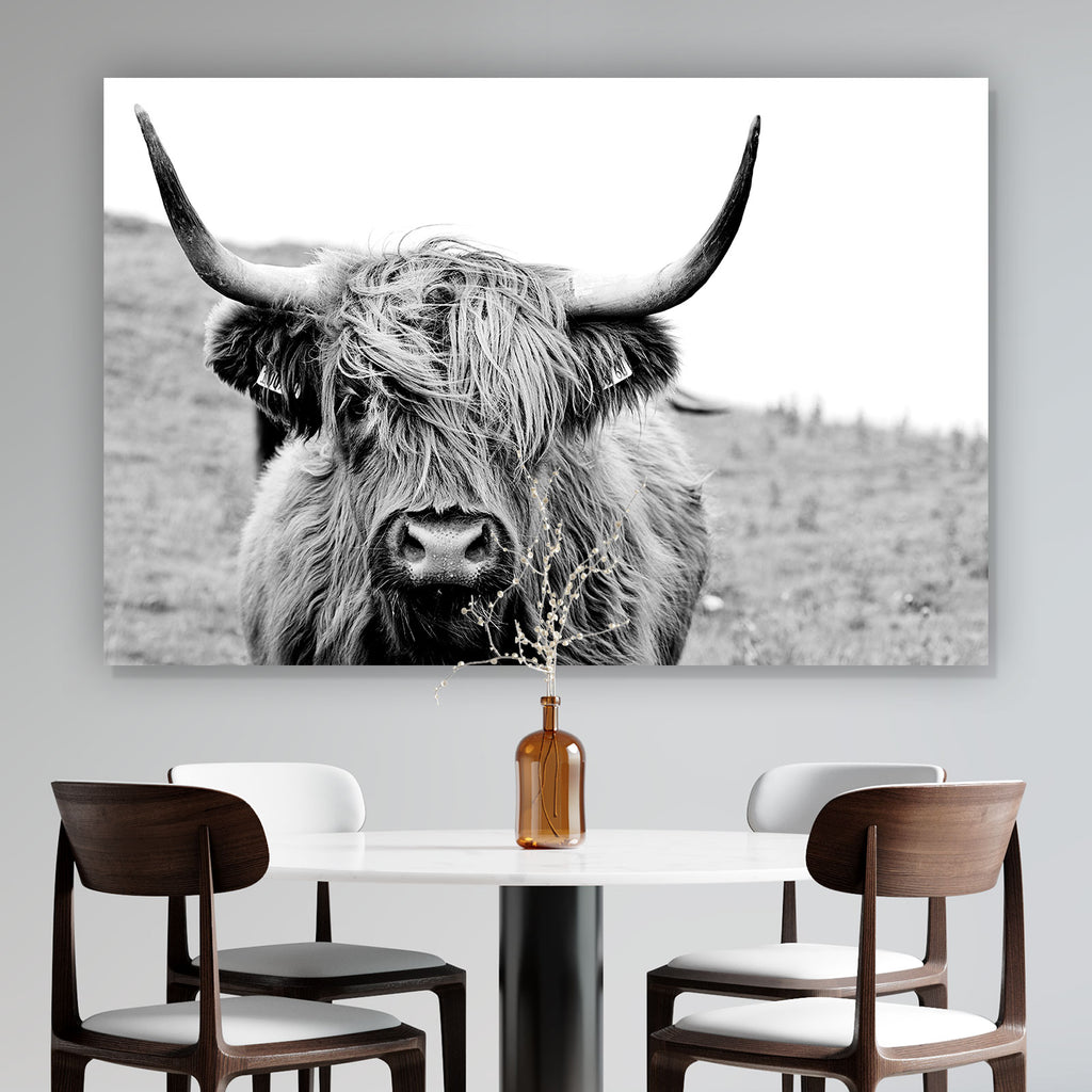 Auf der Suche nach einem ausgefallenen Wandbild als Leinwandbild? Das Motiv Hochlandrind Schwarz Weiß im Querformat gefällt dir und du hast nach Wandbildern mit den Wörtern Schottland, Hochlandrind, Kuh, Tiere, Rinder, Highland, Weide, Skandinavisch, Hochland Rind, Rind und Highland Rind gesucht? Dann ist dieses Leinwandbild in der Farbe Schwarz-Weiß genau das richtige Wandbild und Dekorelement für dich! Setze ein Highlight an deiner Wand! Das Leinwandbild Hochlandrind Schwarz Weiß ist in 5 verschiedenen Größen verfügbar, von klein und dezent bis hin zum XXL Leinwandbild.