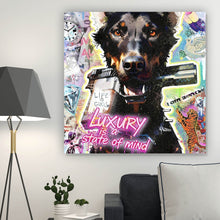 Das Bild zeigt eine lebendiges Pop-Art Bild, die von einem realistischen Hundeporträt dominiert wird. Der Hund hat ein dunkles Fell und schaut direkt in die Kamera, was ihm eine starke Präsenz verleiht. Rund um den Hund sind verschiedene künstlerische Elemente im Graffiti-Stil verteilt. In der oberen linken Ecke steht in lila Schrift "GOOD BOY", während sich in der Mitte der Schriftzug "Luxury is a state of mind" in leuchtendem Pink abhebt. Diese Aussage wird durch die Darstellung von Luxusartikeln wie Diamanten und einer eleganten Uhr verstärkt. Im Hintergrund sind zahlreiche bunte Grafiken zu sehen, darunter ein Cartoon-Charakter, ein Tiger und weitere Symbole, die den urbanen und modernen Stil der Collage unterstreichen. Die Komposition ist dynamisch und farbenfroh, was das Auge des Betrachters anzieht und die verschiedenen Themen und Elemente harmonisch miteinander verbindet. Die Collage vermittelt ein Gefühl von Luxus, Individualität und künstlerischem Ausdruck, eingebettet in eine urbane Ästhetik.