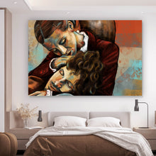 Auf der Suche nach einem ausgefallenen Wandbild als Leinwandbild? Das Motiv Innige Umarmung eines Paares im Querformat gefällt dir und du hast nach Wandbildern mit den Wörtern Kunst, Kreativ, Liebespaar, Umarmung, Menschlichkeit, Liebe und Geborgenheit gesucht? Dann ist dieses Leinwandbild in den Farben Schwarz, Braun, Beige, Orange, Türkis und Rot genau das richtige Wandbild und Dekorelement für dich! Setze ein Highlight an deiner Wand! Das Leinwandbild Innige Umarmung eines Paares ist in 4 verschiedenen Größen verfügbar, von klein und dezent bis hin zum XXL Leinwandbild.