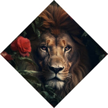 Das Bild zeigt einen beeindruckenden Löwen, der von leuchtend roten Rosen umgeben ist. Der Löwe, Symbol für Stärke und Majestät, blickt direkt in die Kamera, als ob er den Betrachter mit seinem intensiven Blick fixiert. Sein prachtvolles, dichtes Mähnenhaar ist in warmen Brauntönen gehalten, die im Kontrast zu den lebendigen, roten Rosen stehen. Die Rosen mit ihren satten Blütenblättern umrahmen das Gesicht des Löwen, was dem Bild eine mystische und zugleich friedliche Atmosphäre verleiht. Die grünen Blätter der Rosen sorgen für eine natürliche Kulisse und verstärken den Eindruck, dass der Löwe mitten in der Natur verweilt. Diese Kombination aus Wildnis und Eleganz, Stärke und Sanftheit, macht das Bild zu einem faszinierenden Kunstwerk, das die Schönheit und Komplexität der Natur hervorhebt. Es lädt den Betrachter ein, die Ruhe und Erhabenheit des Augenblicks zu genießen, während er die harmonische Verbindung zwischen Tier und Pflanze bewundert.