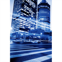 Das Bild zeigt eine lebhafte städtische Szene, die bei Nacht aufgenommen wurde. Im Vordergrund sieht man eine breite Straße mit einem Zebrastreifen, der sich quer über die Fahrbahn zieht. Auf der Straße sind die Lichter vorbeifahrender Fahrzeuge als lange, leuchtende Streifen eingefangen, was den Eindruck von Geschwindigkeit und Bewegung vermittelt. Diese Lichtspuren verleihen dem Bild eine dynamische und energiegeladene Atmosphäre. Hinter der Straße ragen beeindruckende Hochhäuser in den Nachthimmel. Die Fassaden der Gebäude sind größtenteils aus Glas, wodurch das Licht von innen nach außen strahlt und die moderne Architektur betont wird. Die Gebäude sind hell erleuchtet, und die vielen Fenster reflektieren das Licht, was der Skyline einen glitzernden Effekt verleiht. Die überwiegende Farbgebung des Bildes ist in Blautönen gehalten, was eine kühle und futuristische Stimmung erzeugt. Diese Farbpalette verstärkt die urbane und moderne Anmutung der Szene. Der Himmel und die beleuchteten Wolkenkratzer verschmelzen fast miteinander, wodurch die Stadtlandschaft sowohl majestätisch als auch einladend wirkt. Insgesamt vermittelt das Bild das Gefühl einer pulsierenden Metropole, die niemals schläft. Es fängt die Essenz des modernen städtischen Lebens ein, mit all seiner Hektik, seinem Glanz und seiner ständigen Bewegung.