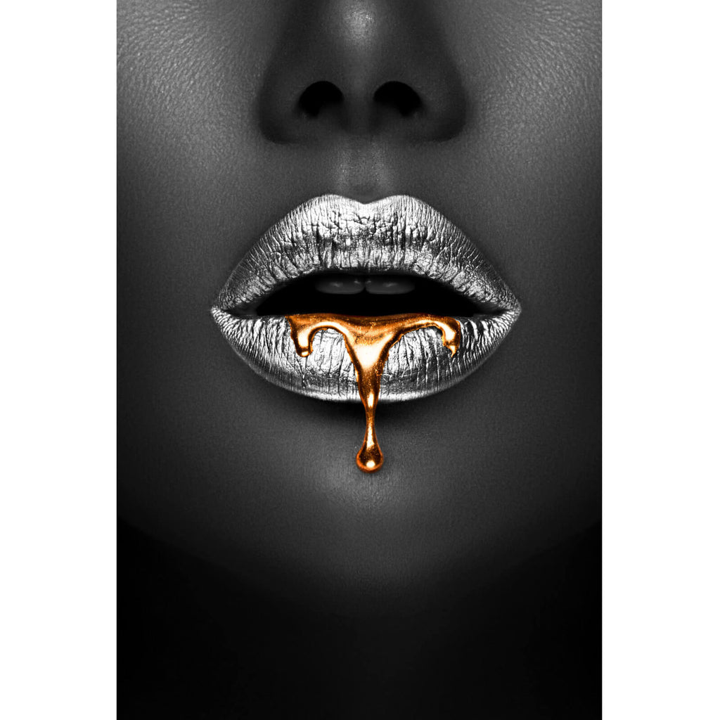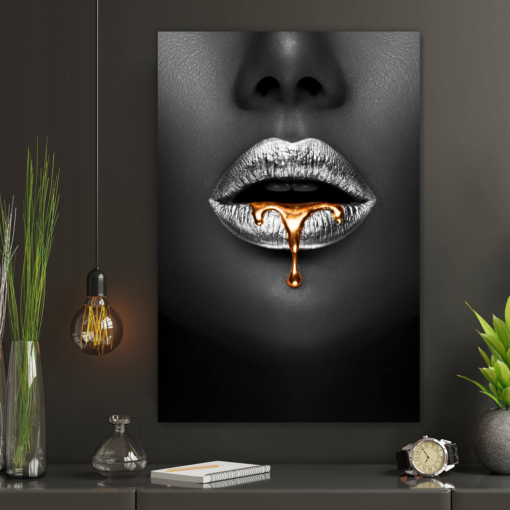 Auf der Suche nach einem ausgefallenen Wandbild als Leinwandbild? Das Motiv Silberfarbene Lippen im Hochformat gefällt dir und du hast nach Wandbildern mit den Wörtern Schönheit, Farbe, Lippen, Tropfen, Kosmetik, Gesicht, Frau, Schminken, Lips, Lipgloss, Erotik und Sexy gesucht? Dann ist dieses Leinwandbild in den Farben Schwarz, Gold und Silber genau das richtige Wandbild und Dekorelement für dich! Setze ein Highlight an deiner Wand! Das Leinwandbild Silberfarbene Lippen ist in 5 verschiedenen Größen verfügbar, von klein und dezent bis hin zum XXL Leinwandbild.
