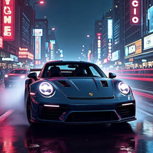 - Motivname: Sportwagen bei Nacht in neonbeleuchteter Stadtstraße