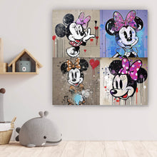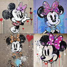 Das Bild zeigt vier verschiedene Darstellungen von einer bekannten Maus in einem lebhaften Graffiti-Stil. Jede Darstellung ist in einem einzigartigen Farbschema gehalten und zeigt die Maus in unterschiedlichen Posen. Die obere linke Ecke zeigt eine lächelnde Maus mit einem rosa Schleife und roten Herzen im Hintergrund, die aus der Mauer zu tropfen scheinen. Rechts oben ist die Maus in einem blauen und lila Farbschema zu sehen, umgeben von spritzender Farbe, die eine energische und dynamische Atmosphäre erzeugt. In der unteren linken Ecke ist die Maus in einem eher erdigen, braunen und blauen Farbschema dargestellt, mit einem großen roten Herz, das ihre verspielte Natur unterstreicht. Die untere rechte Ecke zeigt die Maus in kräftigen Schwarz- und Pinktönen mit einem großen, gepunkteten Schleife. Überall auf dem Bild sind tropfende Farbeffekte zu sehen, die dem Werk einen urbanen und modernen Charakter verleihen. Die Verwendung von Herzen und Punkten verstärkt den verspielten und ikonischen Stil von der Maus und macht das Gesamtbild zu einem lebendigen Kunstwerk, das sowohl nostalgisch als auch zeitgenössisch wirkt.