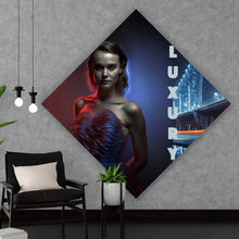 Auf der Suche nach einem ausgefallenen Wandbild als Poster? Das Motiv Elegante Frau vor Brücke und Sportwagen bei Nacht als Raute gefällt dir und du hast nach Wandbildern mit den Wörtern Luxus, Eleganz, Nacht, Brücke, Sportwagen, Frau, Mode, Glanz, Lichter, Modern, Stil, Geschwindigkeit, Fotografie, Glamour, Architektur, Exklusiv, Ästhetik, Auto und Automobil gesucht? Dann ist dieses Poster in den Farben Schwarz, Blau, Rot und Weiß genau das richtige Wandbild und Dekorelement für dich! Setze ein Highlight an deiner Wand! Das Poster Elegante Frau vor Brücke und Sportwagen bei Nacht ist in 2 verschiedenen Größen verfügbar, von klein und dezent bis hin zum XXL Poster.