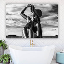 Auf der Suche nach einem ausgefallenen Wandbild als Poster? Das Motiv Frau mit Sonnenhut Schwarz Weiß im Querformat gefällt dir und du hast nach Wandbildern mit den Wörtern Frau, Hut, Modell, Badeanzug, Sexy, Erotik, Strand, Wolken und Ästhetik gesucht? Dann ist dieses Poster in der Farbe Schwarz-Weiß genau das richtige Wandbild und Dekorelement für dich! Setze ein Highlight an deiner Wand! Das Poster Frau mit Sonnenhut Schwarz Weiß ist in 4 verschiedenen Größen verfügbar, von klein und dezent bis hin zum XXL Poster.