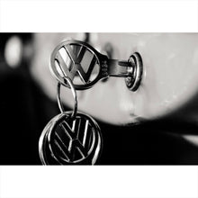 Das Bild zeigt ein Paar klassische Autoschlüssel, die in einem Zündschloss stecken. Die Schlüssel sind aus Metall gefertigt und tragen ein markantes Markenlogo. Dieses Emblem besteht aus einem stilisierten "V" über einem "W" innerhalb eines Kreises, was sofort Assoziationen zu einem bekannten Automobilhersteller weckt. Die glänzende Oberfläche der Schlüssel reflektiert das Licht und hebt das Chrom-Design hervor. Im Hintergrund ist die Struktur eines Fahrzeugarmaturenbretts zu erkennen. Die Bildkomposition konzentriert sich stark auf den Schlüssel und das Zündschloss, während der Hintergrund unscharf bleibt, was dem Bild eine gewisse Tiefe verleiht. Die Schwarz-Weiß-Fotografie betont die Kontraste und verleiht der Szene einen nostalgischen, zeitlosen Charakter. Das Bild vermittelt ein Gefühl von Nostalgie und erinnert an die klassischen Fahrzeuge vergangener Zeiten. Es spricht Liebhaber von Oldtimern und klassischen Automobilen an und weckt Erinnerungen an eine Zeit, in der das Autofahren noch ein besonderes Erlebnis war. Der Fokus auf das Detail und die Qualität des Metalls lässt die Wertschätzung für handwerkliche Präzision und Design erkennen.