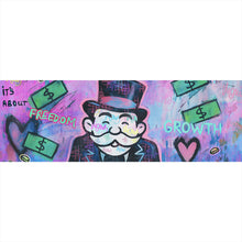 Das Bild zeigt eine kreative und farbenfrohe Graffiti-Kunst mit einem ikonischen Cartoon-Geschäftsmann, der im Schneidersitz meditiert. Er trägt einen schwarzen Frack und einen Zylinder, typisch für eine wohlhabende Figur. Um ihn herum schweben grüne Geldscheine und Münzen, die den Reichtum symbolisieren. Wörter wie "RELAX," "GROWTH," "FREEDOM," und "STRIVE FOR GREATNESS" sind in lebhaften Farben über das Bild verteilt und vermitteln eine positive, motivierende Botschaft. Ein Geldsack mit der Aufschrift "MONEY MAKER" liegt zu seiner linken Seite, verstärkend das Thema des finanziellen Erfolgs. Der Hintergrund ist in leuchtenden Blau- und Pinktönen gehalten, die dem Bild eine energetische und dynamische Atmosphäre verleihen. Herzen und andere kleine Symbole sind ebenfalls zu sehen, was den verspielten und zugleich inspirierenden Charakter des Kunstwerks unterstreicht. Diese visuelle Darstellung kombiniert finanzielle Motive mit einer Botschaft der inneren Ruhe und des Strebens nach persönlicher Größe.