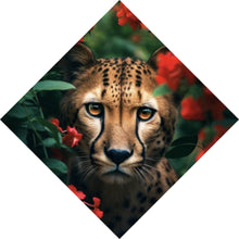 - Motivname: Gepard schaut neugierig durch rote Blumen