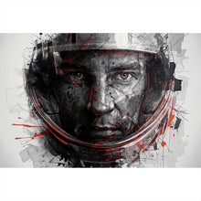 Das Bild zeigt das Gesicht eines Astronauten, das in einer faszinierenden Mischung aus abstrakter Kunst und realistischer Darstellung präsentiert wird. Der Astronautenhelm ist klar erkennbar, während das Gesicht in einem komplexen Geflecht aus Linien und Schattierungen gezeichnet ist. Diese Linien verleihen dem Kunstwerk eine dynamische Energie, als ob es in Bewegung wäre. Die dominierenden Farben sind Schwarz und Weiß, mit kräftigen roten Akzenten, die strategisch über das Bild verteilt sind, um Tiefe und Emotionen zu erzeugen. Die roten Farbspritzer und Linien wirken wie Energieimpulse, die der Darstellung eine moderne und futuristische Atmosphäre verleihen. Die Augen des Astronauten sind hervorstechend und ziehen den Betrachter in ihren Bann, was dem Bild eine persönliche und emotionale Note verleiht. Der Hintergrund ist in einem leichten Grau gehalten, das die zentrale Figur hervorhebt und den Fokus auf das Gesicht legt. Insgesamt verbindet das Kunstwerk technische Präzision mit künstlerischer Freiheit und lädt den Betrachter ein, über die Verbindung zwischen Mensch und Universum nachzudenken.