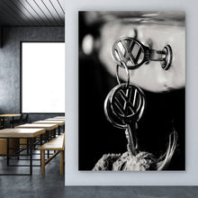 Das Bild zeigt ein Paar klassische Autoschlüssel, die in einem Zündschloss stecken. Die Schlüssel sind aus Metall gefertigt und tragen ein markantes Markenlogo. Dieses Emblem besteht aus einem stilisierten "V" über einem "W" innerhalb eines Kreises, was sofort Assoziationen zu einem bekannten Automobilhersteller weckt. Die glänzende Oberfläche der Schlüssel reflektiert das Licht und hebt das Chrom-Design hervor. Im Hintergrund ist die Struktur eines Fahrzeugarmaturenbretts zu erkennen. Die Bildkomposition konzentriert sich stark auf den Schlüssel und das Zündschloss, während der Hintergrund unscharf bleibt, was dem Bild eine gewisse Tiefe verleiht. Die Schwarz-Weiß-Fotografie betont die Kontraste und verleiht der Szene einen nostalgischen, zeitlosen Charakter. Das Bild vermittelt ein Gefühl von Nostalgie und erinnert an die klassischen Fahrzeuge vergangener Zeiten. Es spricht Liebhaber von Oldtimern und klassischen Automobilen an und weckt Erinnerungen an eine Zeit, in der das Autofahren noch ein besonderes Erlebnis war. Der Fokus auf das Detail und die Qualität des Metalls lässt die Wertschätzung für handwerkliche Präzision und Design erkennen.