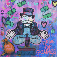 Das Bild zeigt eine kreative und farbenfrohe Graffiti-Kunst mit einem ikonischen Cartoon-Geschäftsmann, der im Schneidersitz meditiert. Er trägt einen schwarzen Frack und einen Zylinder, typisch für eine wohlhabende Figur. Um ihn herum schweben grüne Geldscheine und Münzen, die den Reichtum symbolisieren. Wörter wie "RELAX," "GROWTH," "FREEDOM," und "STRIVE FOR GREATNESS" sind in lebhaften Farben über das Bild verteilt und vermitteln eine positive, motivierende Botschaft. Ein Geldsack mit der Aufschrift "MONEY MAKER" liegt zu seiner linken Seite, verstärkend das Thema des finanziellen Erfolgs. Der Hintergrund ist in leuchtenden Blau- und Pinktönen gehalten, die dem Bild eine energetische und dynamische Atmosphäre verleihen. Herzen und andere kleine Symbole sind ebenfalls zu sehen, was den verspielten und zugleich inspirierenden Charakter des Kunstwerks unterstreicht. Diese visuelle Darstellung kombiniert finanzielle Motive mit einer Botschaft der inneren Ruhe und des Strebens nach persönlicher Größe.
