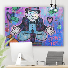Auf der Suche nach einem ausgefallenen Wandbild als Spannrahmenbild? Das Motiv Meditierende Spielfigur mit Geld und motivierenden Sprüchen im Querformat gefällt dir und du hast nach Wandbildern mit den Wörtern Meditation, Geld, Wachstum, Reichtum, Geschäftsmann, Spiel, Haus, Pop Art, Cartoon, Urban, Bunt, Spielfigur, Sprüche, Graffiti, Zylinder, Münzen und Geldscheine gesucht? Dann ist dieses Spannrahmenbild in der Farbe Bunt genau das richtige Wandbild und Dekorelement für dich! Setze ein Highlight an deiner Wand! Das Spannrahmenbild Meditierende Spielfigur mit Geld und motivierenden Sprüchen ist in 4 verschiedenen Größen verfügbar, von klein und dezent bis hin zum XXL Spannrahmenbild.
