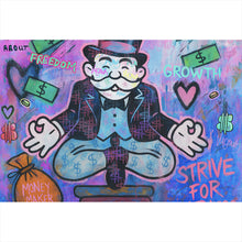 Das Bild zeigt eine kreative und farbenfrohe Graffiti-Kunst mit einem ikonischen Cartoon-Geschäftsmann, der im Schneidersitz meditiert. Er trägt einen schwarzen Frack und einen Zylinder, typisch für eine wohlhabende Figur. Um ihn herum schweben grüne Geldscheine und Münzen, die den Reichtum symbolisieren. Wörter wie "RELAX," "GROWTH," "FREEDOM," und "STRIVE FOR GREATNESS" sind in lebhaften Farben über das Bild verteilt und vermitteln eine positive, motivierende Botschaft. Ein Geldsack mit der Aufschrift "MONEY MAKER" liegt zu seiner linken Seite, verstärkend das Thema des finanziellen Erfolgs. Der Hintergrund ist in leuchtenden Blau- und Pinktönen gehalten, die dem Bild eine energetische und dynamische Atmosphäre verleihen. Herzen und andere kleine Symbole sind ebenfalls zu sehen, was den verspielten und zugleich inspirierenden Charakter des Kunstwerks unterstreicht. Diese visuelle Darstellung kombiniert finanzielle Motive mit einer Botschaft der inneren Ruhe und des Strebens nach persönlicher Größe.