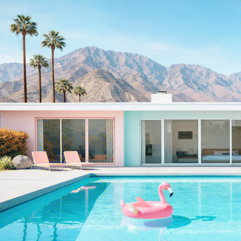 Dieses beeindruckende Wandbild zeigt ein modernes Poolhaus, das in einer atemberaubenden Bergkulisse eingebettet ist. Das Bild fängt die Essenz luxuriösen Lebensstils ein, indem es einen großzügigen Swimmingpool und stilvolle Architektur miteinander vereint. Hohe Palmen umrahmen das Gebäude und schaffen eine tropische Atmosphäre, die zum Entspannen und Genießen einlädt. Die klaren Linien und das minimalistische Design des Hauses strahlen Ruhe und Eleganz aus, während die imposanten Berge im Hintergrund für eine majestätische Szenerie sorgen. Dieses Motiv eignet sich hervorragend, um in Innenräumen eine Oase der Ruhe zu schaffen und den Betrachter in eine Welt der Gelassenheit und des Komforts zu entführen. Die Bildkomposition bietet Tiefe und eine harmonische Balance zwischen natürlicher und vom Menschen geschaffener Schönheit. Es ist perfekt für moderne Wohnräume, in denen ein Hauch von Exklusivität und Erholung gefragt ist. Die Darstellung vermittelt das Gefühl von Freiheit und Abenteuer, während gleichzeitig ein Rückzugsort der Ruhe geboten wird. Ideal für Räume, die eine beruhigende und inspirierende Wirkung haben sollen.