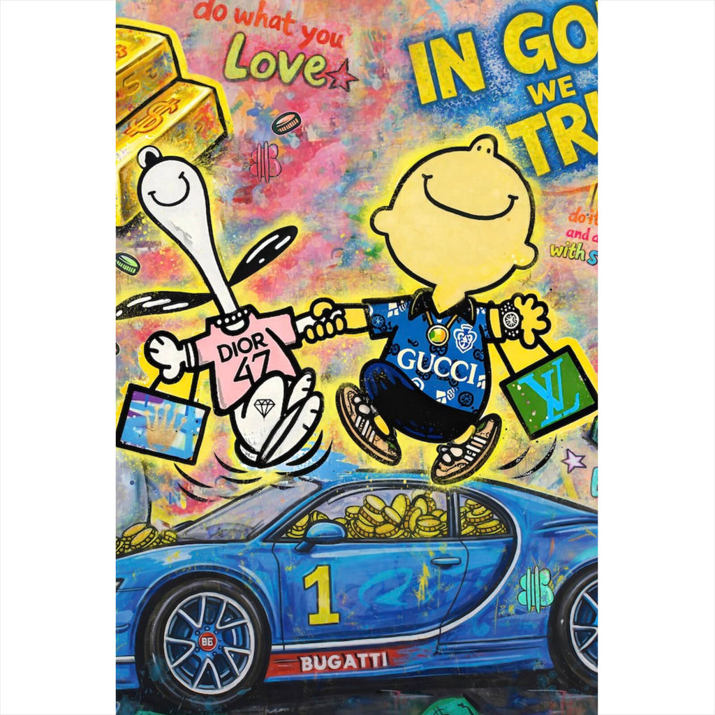 Dieses beeindruckende Wandbild im Pop Art Stil verbindet Luxus und Humor auf kreative Weise. Im Mittelpunkt steht ein luxuriöses Motiv, das Reichtum und Markenbewusstsein symbolisiert. Die Darstellung eines exklusiven Autos, umgeben von ikonischen Markenaccessoires, vermittelt ein Gefühl von Wohlstand und Stil. Die Figuren strahlen Freude und Unbeschwertheit aus, während sie in einem Meer von Luxusartikeln schwimmen. Die dynamische Komposition und die vielfältigen Symbole erzeugen eine lebendige, moderne Atmosphäre, die sowohl inspirierend als auch motivierend wirkt. Durch die Anspielungen auf Reichtum und Erfolg wird das Bild zu einem starken Statement für Selbstbewusstsein und Lebensfreude. Ideal für Räume, die eine exklusive und zugleich humorvolle Note benötigen, zieht dieses Kunstwerk garantiert alle Blicke auf sich und regt zum Nachdenken über Luxus und Lebensträume an.