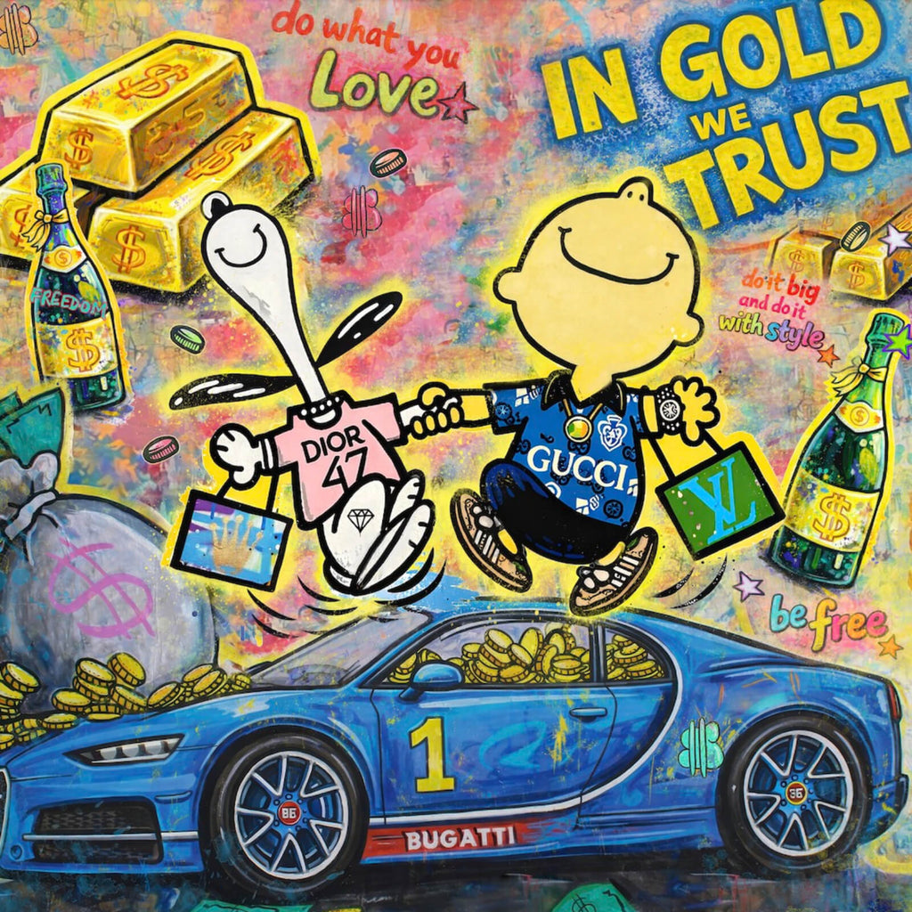 Dieses beeindruckende Wandbild im Pop Art Stil verbindet Luxus und Humor auf kreative Weise. Im Mittelpunkt steht ein luxuriöses Motiv, das Reichtum und Markenbewusstsein symbolisiert. Die Darstellung eines exklusiven Autos, umgeben von ikonischen Markenaccessoires, vermittelt ein Gefühl von Wohlstand und Stil. Die Figuren strahlen Freude und Unbeschwertheit aus, während sie in einem Meer von Luxusartikeln schwimmen. Die dynamische Komposition und die vielfältigen Symbole erzeugen eine lebendige, moderne Atmosphäre, die sowohl inspirierend als auch motivierend wirkt. Durch die Anspielungen auf Reichtum und Erfolg wird das Bild zu einem starken Statement für Selbstbewusstsein und Lebensfreude. Ideal für Räume, die eine exklusive und zugleich humorvolle Note benötigen, zieht dieses Kunstwerk garantiert alle Blicke auf sich und regt zum Nachdenken über Luxus und Lebensträume an.