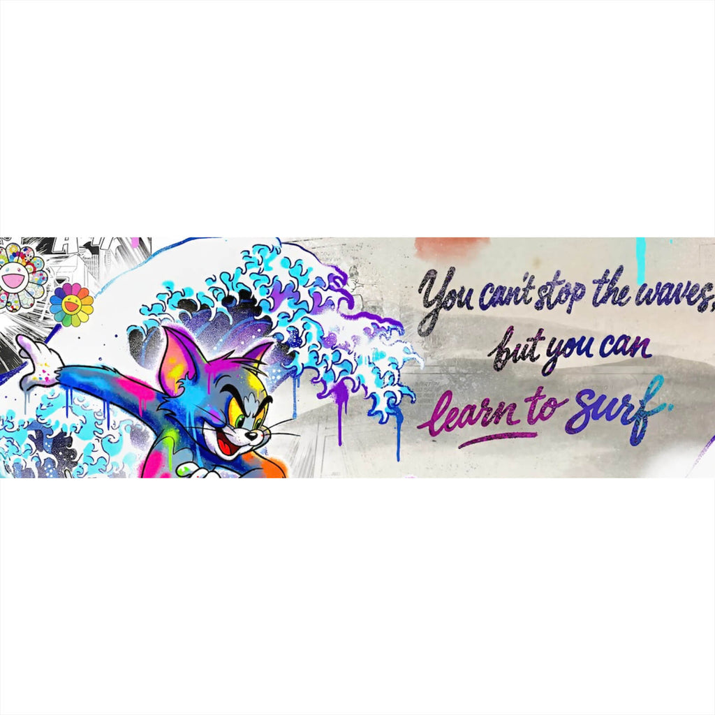 Dieses moderne Wandbild kombiniert dynamische Cartoon-Elemente mit einem inspirierenden Motivationsspruch. Im Vordergrund sind zwei Charaktere auf Surfbrettern in einer lebhaften und energiegeladenen Szene dargestellt, die das Gefühl von Abenteuerlust und Lebensfreude vermittelt. Die Wellen scheinen nahezu aus dem Bild herauszuspringen, was dem Kunstwerk eine beeindruckende Tiefe verleiht. Der Motivationsspruch "You can't stop the waves, but you can learn to surf" fügt eine philosophische Dimension hinzu, die zum Nachdenken anregt und positive Energie ausstrahlt. Der Stil des Bildes ist stark von der Pop Art beeinflusst, wobei klare Linien und kräftige Formen ins Auge springen. Die gesamte Komposition ist darauf ausgelegt, eine fröhliche und motivierende Atmosphäre zu schaffen, die sowohl in modernen Wohnräumen als auch in kreativen Arbeitsbereichen hervorragend zur Geltung kommt. Dieses Wandbild ist eine ideale Wahl für alle, die ihre Umgebung mit einem Hauch von Humor und Inspiration aufwerten möchten.