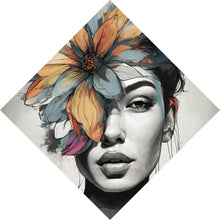 Auf der Suche nach einem ausgefallenen Wandbild als Aluminiumbild? Das Motiv Abstraktes Frauenportrait mit Blumenkrone als Raute gefällt dir und du hast nach Wandbildern mit den Wörtern Frau, Blumenkrone, Schönheit, Gesicht, Blüten, Ausdruck, Eleganz, Portrait und Mode gesucht? Dann ist dieses Aluminiumbild in den Farben Grau, Orange, Pink, Weiß, Schwarz-Weiß, Türkis und Grün genau das richtige Wandbild und Dekorelement für dich! Setze ein Highlight an deiner Wand! Das Aluminiumbild Abstraktes Frauenportrait mit Blumenkrone ist in 4 verschiedenen Größen verfügbar, von klein und dezent bis hin zum XXL Aluminiumbild.