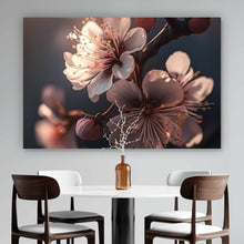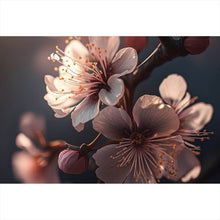 Das Bild zeigt eine Nahaufnahme von zarten Kirschblüten in voller Blüte. Die Blütenblätter sind in sanftem Rosa und Weiß gehalten und strahlen eine natürliche Eleganz aus. Sie sind an einem Ast befestigt, der in einem dunkleren Braunton erscheint, was einen schönen Kontrast zu den hellen Blüten bildet. Das Bild fängt das Licht eines milden Sonnenstrahls ein, der die Blütenblätter durchdringt und ihnen einen fast durchscheinenden Glanz verleiht. Die Details der Blütenstempel und -staubblätter sind fein sichtbar, was dem Bild eine besondere Tiefe und Textur verleiht. Im Hintergrund sind weitere unscharfe Blüten zu erkennen, die dem Bild eine sanfte Unschärfe und Tiefe verleihen. Diese Komposition vermittelt ein Gefühl von Ruhe und Romantik und lädt den Betrachter ein, die Schönheit und Vergänglichkeit der Natur im Frühling zu genießen. Die Kirschblüten symbolisieren oft Neubeginn und Hoffnung, was dem Bild eine zusätzliche Bedeutungsebene verleiht.