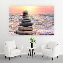 Das wunderschöne Landschaftsbild im Feng Shui Style lädt zu entspannten Abenden ein. Ein zeitloses Wandbild von Steinen im Sonnenuntergang. Das Motiv strahlt Ruhe und Kraft aus. Damit gehört deine farblose Wand der Vergangenheit an. Verwandle dein Zuhause in einen Ruhepol.
