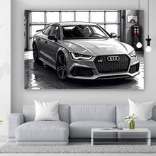 • Lade das Bild in den Galerie-Viewer, Aluminiumbild Sportwagen in einer Werkstatt vor Garagentor Querformat