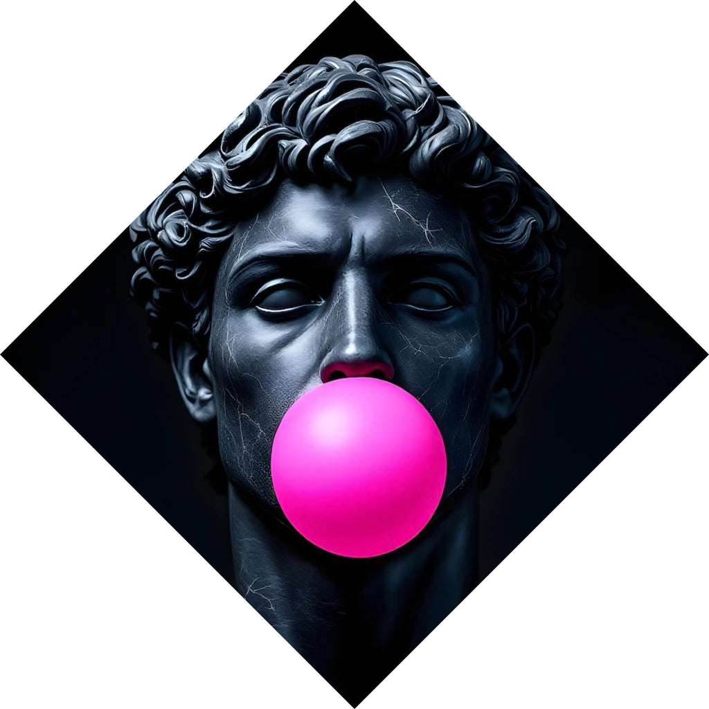 Dieses eindrucksvolle Wandbild zeigt einen edlen Skulpturenkopf, der durch einen modernen Pop-Art-Stil besticht. Der Fokus liegt auf einem markanten Kaugummi, das dem klassischen Motiv eine unerwartete, spielerische Note verleiht. Die Kombination aus traditioneller Skulptur und zeitgenössischem Element schafft eine faszinierende Spannung, die sowohl stilvoll als auch provokant wirkt. Der Skulpturenkopf ist detailliert gearbeitet, mit ausgeprägten Gesichtszügen und kunstvollen Locken, die dem Bild Tiefe und Charakter verleihen. Der massive, glänzende Schmuck um den Hals der Figur betont die luxuriöse Ästhetik und verstärkt den Eindruck von Eleganz und Reichtum. Das Bild vermittelt eine starke Präsenz und eignet sich hervorragend als zentrales Dekorationselement in modernen Wohnräumen oder Büros. Die Mischung aus klassischem und modernem Stil macht es zu einem Blickfang, der Diskussionen anregt und künstlerischen Ausdruck mit zeitgenössischer Coolness verbindet. Dieses Kunstwerk eignet sich perfekt für alle, die eine Vorliebe für außergewöhnliche und charakterstarke Dekoration haben.