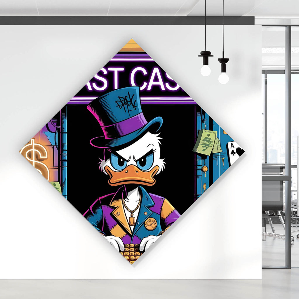 Dieses eindrucksvolle Wandbild zeigt ein charakteristisches Entenmotiv, das in einer modernen und pop-artigen Stilrichtung gestaltet ist. Die Ente, gekleidet in einem stilvollen Anzug mit Zylinder, sitzt vor einem Tisch voller Münzen, was einen starken Bezug zu Themen wie Reichtum und Investition herstellt. Umgeben von Geldsymbolen und Spielkarten entsteht eine spielerische, humorvolle Atmosphäre, die gleichzeitig Luxus und Kreativität ausstrahlt. Die Komposition ist dynamisch, mit klaren Linien und einem harmonischen Aufbau, der die Blicke auf sich zieht und jedes Zimmer, ob Wohnzimmer, Büro oder Hobbyraum, bereichert. Das Bild vermittelt eine Botschaft von Wohlstand und Erfolg und dient als ausdrucksstarkes Statement-Piece. Die künstlerische Umsetzung im Cartoon-Stil verleiht der Darstellung einen humorvollen Touch, der sowohl Sammler als auch Kunstliebhaber anspricht. Die moderne Materialanmutung und die lebendige Darstellung sorgen für eine intensive Raumwirkung, die eine inspirierende und zugleich unterhaltsame Stimmung schafft. Dieses Wandbild ist perfekt für alle, die nach einem einzigartigen und kreativen Dekorationselement suchen, das gleichzeitig Stil und Persönlichkeit vermittelt.