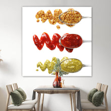 Auf der Suche nach einem ausgefallenen Wandbild als Poster? Das Motiv Löffel mit verschiedenen Soßen im Quadrat gefällt dir und du hast nach Wandbildern mit den Wörtern Essen, Geschmack, Soße, Löffel, Besteck, Köstlich, Gastronomie, Kochen und Gewürz gesucht? Dann ist dieses Poster in der Farbe Bunt genau das richtige Wandbild und Dekorelement für dich! Setze ein Highlight an deiner Wand! Das Poster Löffel mit verschiedenen Soßen ist in 2 verschiedenen Größen verfügbar, von klein und dezent bis hin zum XXL Poster.