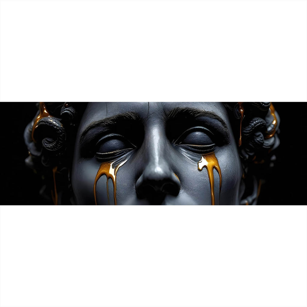 Auf der Suche nach einem ausgefallenen Wandbild als Poster? Das Motiv Medusa Skulptur weinend mit goldener Verzierung im Panorama gefällt dir und du hast nach Wandbildern mit den Wörtern Medusa, Göttin, Meeresgott, Mythos, Skulptur, Eleganz, Mysterium, Ästhetik, Mythologie, Lateinisch und Griechisch gesucht? Dann ist dieses Poster in den Farben Schwarz und Gold genau das richtige Wandbild und Dekorelement für dich! Setze ein Highlight an deiner Wand! Das Poster Medusa Skulptur weinend mit goldener Verzierung ist in 3 verschiedenen Größen verfügbar, von klein und dezent bis hin zum XXL Poster.