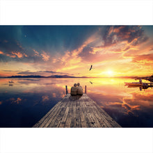 Auf der Suche nach einem ausgefallenen Wandbild als Poster? Das Motiv Paar auf Holzsteg bei Sonnenuntergang im Querformat gefällt dir und du hast nach Wandbildern mit den Wörtern Liebe, Paar, Sonnenuntergang, Wasser, Steg, Romantik, Natur, Personen, Wolken und Vögel gesucht? Dann ist dieses Poster in den Farben Blau, Braun und Orange genau das richtige Wandbild und Dekorelement für dich! Setze ein Highlight an deiner Wand! Das Poster Paar auf Holzsteg bei Sonnenuntergang ist in 4 verschiedenen Größen verfügbar, von klein und dezent bis hin zum XXL Poster.