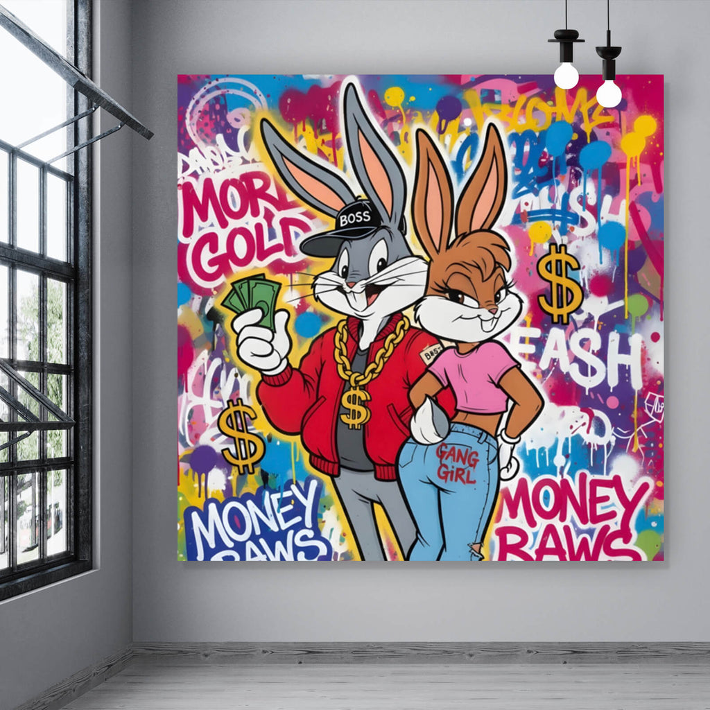 Dieses beeindruckende Wandbild kombiniert die Lebendigkeit von Graffiti mit der Verspieltheit von Cartoons und schafft so ein dynamisches Kunstwerk, das sowohl moderne als auch popkulturelle Elemente vereint. Die Figuren sind in einem urbanen Stil gehalten, der durch den starken Einsatz von Text und Symbolik ergänzt wird, was das Thema Geld und Luxus hervorhebt. Die ausgeprägte Materialanmutung des Sprühens verleiht dem Bild eine texturierte Tiefe, die in jedem Raum eine lebendige Atmosphäre schafft. Das Motiv zeigt zwei Cartoon-Charaktere, die durch ihre Haltung und Accessoires einen luxuriösen Lebensstil verkörpern. Diese stilvolle und kreative Darstellung zieht sofort die Aufmerksamkeit auf sich und dient als perfekter Blickfang in modernen Wohn- oder Arbeitsbereichen. Der Gesamteindruck ist kraftvoll und ausdrucksstark, was es zu einem idealen Statement-Stück für alle macht, die ihrer Umgebung einen Hauch von urbaner Coolness verleihen möchten. Durch die Mischung aus Humor und Gesellschaftskritik entsteht ein einzigartiges Kunstwerk, das sowohl zum Nachdenken anregt als auch unterhält.