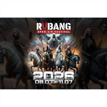 Das Bild zeigt eine dramatische und atmosphärische Darstellung eines Open Air Musikfestivals, das als „Rvbang Open Air Festival“ beworben wird. Im Vordergrund sind vier apokalyptische Reiter zu sehen, die auf mächtigen Pferden reiten. Diese Reiter sind in dunkle Gewänder gehüllt und tragen bedrohlich wirkende Stäbe oder Waffen. Die Pferde, auf denen sie reiten, scheinen aus einer anderen Welt zu stammen, mit leuchtenden Augen und muskulösen Körpern. Über den Reitern erhebt sich eine bedrohliche Gestalt mit weit ausgebreiteten Flügeln, die den Himmel dominiert. Der Hintergrund ist in düsteren, stürmischen Farben gehalten, die eine apokalyptische Stimmung erzeugen. Am unteren Rand des Bildes befindet sich die Jahreszahl „2026“, gefolgt von den Daten „09.07 - 11.07“, was das Datum des Festivals anzeigt. Die Gesamtkomposition des Bildes vermittelt ein Gefühl von Spannung und Vorfreude, das perfekt zu einem großen, epischen Musikfestival passt. Die visuelle Darstellung spricht Fans von dramatischer und fantastischer Kunst an, die ein intensives Musikerlebnis erwarten.