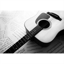 Auf der Suche nach einem ausgefallenen Wandbild als Spannrahmenbild? Das Motiv Akustik Gitarre auf Noten im Querformat gefällt dir und du hast nach Wandbildern mit den Wörtern Gitarre, Noten, Musik, Instrument und Unterhaltung gesucht? Dann ist dieses Spannrahmenbild in der Farbe Schwarz-Weiß genau das richtige Wandbild und Dekorelement für dich! Setze ein Highlight an deiner Wand! Das Spannrahmenbild Akustik Gitarre auf Noten ist in 5 verschiedenen Größen verfügbar, von klein und dezent bis hin zum XXL Spannrahmenbild.
