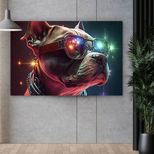 Das Spannrahmenbild Pitbull galaktisch Digital Art im Querformat gehört mit großem Abstand zu den edelsten Wandbildvarianten. Textilspannrahmen, oft auch Frameless, Aluframes oder Textilspannrahmen genannt, sind die perfekte Kombination aus einem 20 mm starken eloxiertem Aluminiumrahmen und einem hochwertigen Sublimationsdruck auf einem Textil Banner. Der leichte Alurahmen, das Textilbanner mit Gummilippe und eine Aufhängung gibt es bei uns im praktischen Komplettset. Spannbilder sind eine großartige Alternative zu allen anderen Wandbild Arten und vermitteln eine luxuriöse und anmutende Ausstrahlung. Auch ein kurzfristiger Motivwechsel ist mit einem Spannrahmenbild kein Problem mehr, da die Drucke einfach austauschbar sind. Da sich der Rahmen ja dann bereits im Besitz befindet, kann einfach ein passender Ersatzdruck kostengünstig nachbestellt werden, selbstverständlich auch mit einem anderen Motiv. Im Handumdrehen erstrahlt die Wand in neuem Glanz. Der Textildruck ist B1 zertifiziert und somit auch ideal für Gewerbe, Büro oder Praxis. Spannrahmenbilder, die auch nach Jahren noch wie neu aussehen und strahlen.