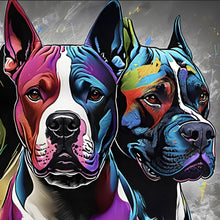 Auf der Suche nach einem ausgefallenen Wandbild als Spannrahmenbild? Das Motiv Portrait von drei markanten Hunden im Quadrat gefällt dir und du hast nach Wandbildern mit den Wörtern Street-Art, Urban, Tier, Hund, Pitbull, Markant, Dynamisch, Stark, Pop Art und Graffiti gesucht? Dann ist dieses Spannrahmenbild in der Farbe Bunt genau das richtige Wandbild und Dekorelement für dich! Setze ein Highlight an deiner Wand! Das Spannrahmenbild Portrait von drei markanten Hunden ist in 4 verschiedenen Größen verfügbar, von klein und dezent bis hin zum XXL Spannrahmenbild.