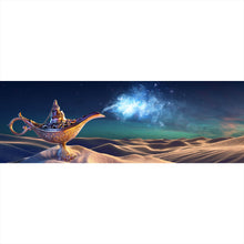 Auf der Suche nach einem ausgefallenen Wandbild als Spannrahmenbild? Das Motiv Wunderlampe in der Wüste bei Nacht im Panorama gefällt dir und du hast nach Wandbildern mit den Wörtern Wunderlampe, Wüste, Nacht und Wünsche gesucht? Dann ist dieses Spannrahmenbild in den Farben Blau und Gold genau das richtige Wandbild und Dekorelement für dich! Setze ein Highlight an deiner Wand! Das Spannrahmenbild Wunderlampe in der Wüste bei Nacht ist in 4 verschiedenen Größen verfügbar, von klein und dezent bis hin zum XXL Spannrahmenbild.