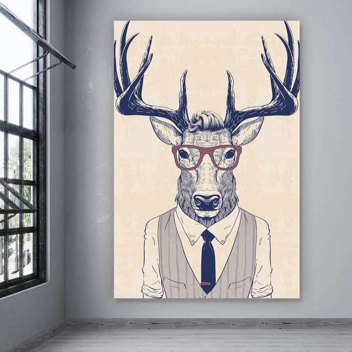 Spannrahmenbild Hirsch mit Anzug im Zeichenstil Hochformat